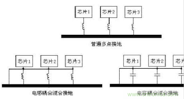 混hun合he接jie地di則ze是shi結jie合he了le單dan點dian接jie地di和he多duo點dian接jie地di的de綜zong合he應ying用yong,既ji包bao含han了le單dan點dian接jie地di的de特te性xing,又you包bao含han了le多duo點dian接jie地di的de特te性xing。一yi般ban是shi在zai單dan點dian接jie地di的de基ji礎chu上shang再zai通tong過guo一yi些xie電dian感gan或huo電dian容rong多duo點dian接jie地di(如圖8-7所示),它是利用電感、電dian容rong器qi件jian在zai不bu同tong頻pin率lv下xia有you不bu同tong阻zu抗kang的de特te性xing,使shi地di線xian係xi統tong在zai不bu同tong的de頻pin率lv下xia具ju有you不bu同tong的de接jie地di結jie構gou,主zhu要yao適shi用yong於yu工gong作zuo在zai混hun合he頻pin率lv下xia的de電dian路lu係xi統tong。比bi如ru對dui於yu電dian容rong耦ou合he的de混hun合he接jie地di策ce略lve中zhong,在zai低di頻pin情qing況kuang時shi,對dui於yu直zhi流liu,電dian容rong是shi開kai路lu的de,等deng效xiao為wei單dan點dian接jie地di,而er在zai高gao頻pin下xia則ze利li用yong電dian容rong對dui交jiao流liu信xin號hao的de低di阻zu抗kang特te性xing,電dian容rong是shi導dao通tong的de,整zheng個ge電dian路lu表biao現xian為wei多duo點dian接jie地di。