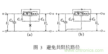 電源線的布置要根據電流的大小盡量加粗走線寬度。在布線工作的最後,用地線將電路板沒有走線的地方鋪滿(大麵積) 。在接地時還需要避免共阻抗路徑,如圖8-10所示穩壓器電路的“調整端的取樣點”或“公共點”,千萬不能接在有負載電流流過的輸出線和公共地線上如圖(a)所示,應從管腳’根部’單獨另外用引線引出如圖(b)所示。