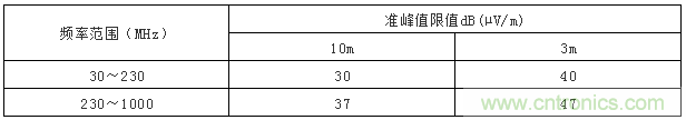一般不同頻率段的限值是不一樣的,過渡頻率點應該采取較低的限值,表1中230MHz的限值應取較低值:30dB(µV/m)(10m法),40dB(µV/m)(3m法)。