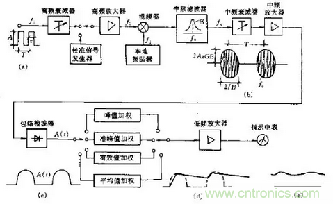 其電路結構類似於半導體收音機。測量時先將測量儀調諧,對準某個頻率fi。該頻率經高頻衰減器和高頻放大器後進人混頻器,與本地振蕩器的頻率fl混頻,產生很多混頻信號。經過中頻濾波器以後僅得到中頻f0=fl-fi。中頻信號經中頻衰減器、中頻放大器後,由包絡檢波器進行包絡檢波,濾去中頻得到其低頻包絡信號A(t)。A(t)再進一步進行加權檢波,加權可根據需要獲得A(t)的峰值(Peak)、有效值(rms)、平均值(Ave)或準峰值(QP),這些值經低頻放大後可推動電表指示。測量前如果用校準信號發生器的信號進行預先校準, 則可以直接讀數。騷擾信號的讀數等效於正弦信號的有效植。
