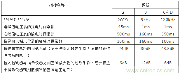 綜上所述,騷擾測量儀必須具有統一的中頻帶寬、檢波器充放電時間常數、電表機械時間常數和過載係數,這樣才能保證在測量同一脈衝信號時得到一致的結果。表2為GB/T6113.1規定的騷擾測量儀指標。其中各頻率段的範圍為:
