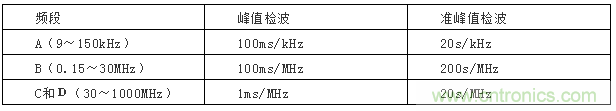 峰值測量時中頻帶是可以選擇的,其選擇範圍和優選值如表5所示,在給出騷擾電平時應標明所選帶寬。對於非重疊騷擾,指中頻段輸出波形中的各個主瓣不重疊,見圖3中(b)點波形,由於峰值測量結果和帶寬成正比,所以測量結果也可用對於1MHz帶寬的歸一化值V1MHz (dBμV/MHz)來表示。