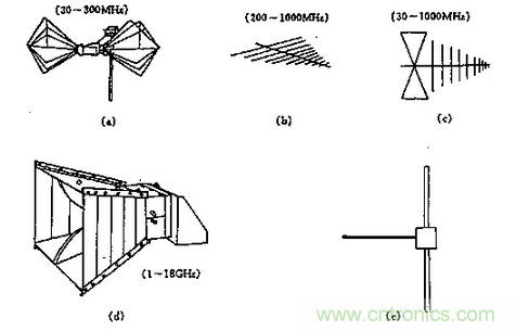 (a) 雙錐天線 (b)對數周期天線 (c)混合寬帶天線 (d)喇叭天線 (e)對稱振子天線