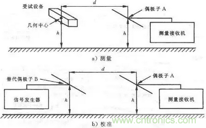 測試距離d雖然沒有明確要求,但最好還應符合遠場條件。d的起始點為EUT的幾何中心,終止點為測量天線A的天線中心。替代試驗和校準試驗時,替代天線B應置於EUT 的幾何中心。