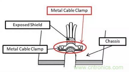 一個好的電磁幹擾屏蔽是通過一個完整的360°外殼周圍的保護裝置來完成。完整的360°屏蔽是環繞整個受保護設備(例如電纜)並將其連接到底盤(見圖1)的環向終止端子上。