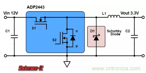 下圖是一個典型的降壓同步開關穩壓電路(查看Scheme-it原理圖),其使用ADI ADP2443為同步開關穩壓芯片。采用N溝道MOSFET和額外的肖特基二極管,可最大限度地減少幹擾。