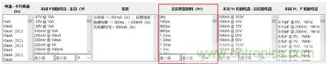 Digi-Key官網上,肖特基二極管選型列表中,提供“反向恢複時間”欄。為了減少額外的電磁幹擾,反向恢複時間越小越好。