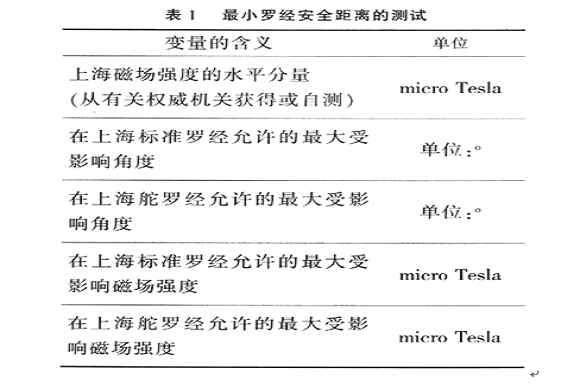 羅(luo)經(jing)最(zui)小(xiao)安(an)全(quan)距(ju)離(li)的(de)測(ce)試(shi)方(fang)法(fa)是(shi)利(li)用(yong)地(di)球(qiu)磁(ci)場(chang)強(qiang)度(du)與(yu)角(jiao)度(du)的(de)關(guan)係(xi),將(jiang)對(dui)角(jiao)度(du)的(de)測(ce)量(liang)轉(zhuan)化(hua)為(wei)對(dui)磁(ci)場(chang)強(qiang)度(du)的(de)測(ce)最(zui)。在(zai)上(shang)海(hai)地(di)區(qu)的(de)測(ce)試(shi)方(fang)法(fa)如(ru)表(biao)1所示。