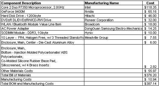 這種新一代Mac Mini的入門級版本的材料成本是376.20美元,如果計入製造成本,則總成本升至387.14美元。這種低端型號的Mac Mini價格是599美元,這表明與蘋果公司的iPod產品等低成本消費產品相比,其個人電腦的材料成本/製造利潤相對較低。