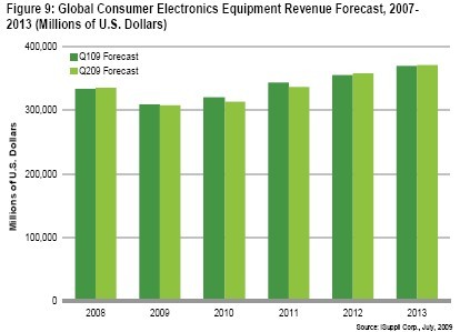 預計全球消費電子營收仍將下降8.2%,從2008年的3,350億美元下降到約3,080億美元。但iSuppli估計2010年市場將開始複蘇,營收將增長2%,達到3,140億美元。預計未來五年將實現持續增長,到2013年達到3,700億美元。