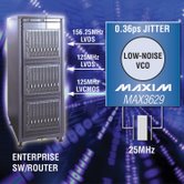 MAX3627和MAX3629具有優異的電源噪聲抑製(PSNR),能(neng)夠(gou)最(zui)大(da)程(cheng)度(du)地(di)減(jian)小(xiao)嘈(cao)雜(za)電(dian)源(yuan)對(dui)抖(dou)動(dong)性(xing)能(neng)的(de)影(ying)響(xiang),使(shi)係(xi)統(tong)整(zheng)體(ti)抖(dou)動(dong)指(zhi)標(biao)的(de)劣(lie)化(hua)最(zui)小(xiao),提(ti)高(gao)係(xi)統(tong)時(shi)鍾(zhong)設(she)計(ji)的(de)質(zhi)量(liang),同(tong)時(shi)也(ye)節(jie)省(sheng)了(le)電(dian)路(lu)板(ban)空(kong)間(jian)和(he)成(cheng)本(ben)。MAX3627/MAX3629可理想用於以太網接口,例如:企業交換機、路由器及其它需要低抖動以太網時鍾的高速數據通信係統等。