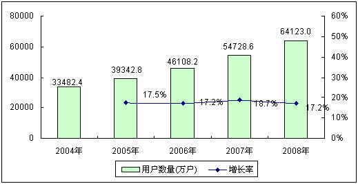 - 2004~2008年,中國移動電話用戶數量每年都保持著17%以上的快速增長