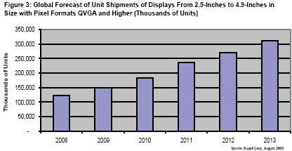 - 2.5英寸~4.9英寸、像素格式為QVGA 及更高的手機LCD顯示屏的出貨量2009年將增加到1.499億台