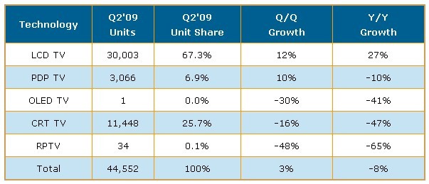 - 2009年第二季全球出貨全球電視機出貨量為4千460萬台,較去年同期下滑8%