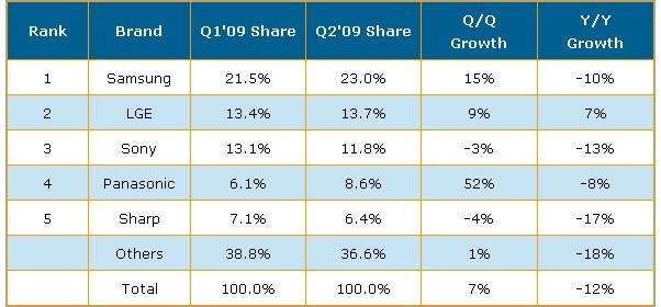 - 第二季LGE出貨金額市占率達13.7%,Sony 市占率僅達11.8%