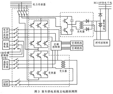 DC600V空調客車供電係統采用機車集中整流,客車分散逆變方式,構成了整個列車的交一直一交變流供電係統。工作過程為:電力機車將25kV電網單相交流電降壓、整流、濾波成DC600V後給客車供電,客車根據用電設備的需要,將機車提供的DC600V變換成單、三相交流電及DC110V。係統采用兩套獨立供電。具有一定的冗餘,客車供電的基本原理圖如圖3所示。