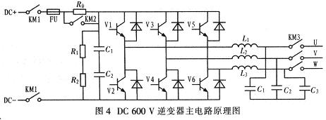 (3)由R0和KM2組成的緩衝電路,工作原理為:在輸入端施加電壓時,先通過緩衝電阻R0對電容充電。當電容電壓充到一定值時(比如540V),KM2吸合,將R0短路。隻有電阻R0短路,三相逆變電路才能啟動工作。