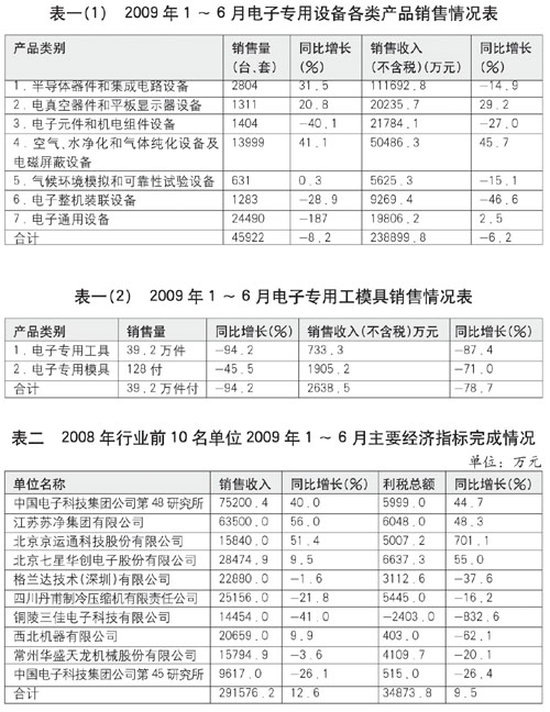 今年上半年電子專用設備和電子專用工模具各大類產品銷售情況詳見表一。電子專用設備7大類產品上半年銷售收入(不含稅)為23.89億元,比去年同期減少6.2%。其中:淨化設備和平板顯示器設備今年上半年增長較快,分別達到45.7%和29.2%。其(qi)他(ta)電(dian)子(zi)專(zhuan)用(yong)設(she)備(bei)和(he)電(dian)子(zi)工(gong)模(mo)具(ju),除(chu)電(dian)子(zi)通(tong)用(yong)設(she)備(bei)略(lve)有(you)增(zeng)長(chang)外(wai),均(jun)比(bi)去(qu)年(nian)同(tong)期(qi)有(you)較(jiao)大(da)的(de)跌(die)幅(fu)。其(qi)中(zhong)占(zhan)電(dian)子(zi)專(zhuan)用(yong)設(she)備(bei)銷(xiao)售(shou)收(shou)入(ru)一(yi)半(ban)的(de)半(ban)導(dao)體(ti)設(she)備(bei),今(jin)年(nian)上(shang)半(ban)年(nian)銷(xiao)售(shou)收(shou)入(ru)比(bi)去(qu)年(nian)同(tong)期(qi)下(xia)跌(die)了(le)14.9%。