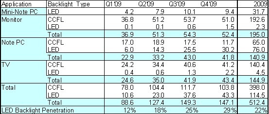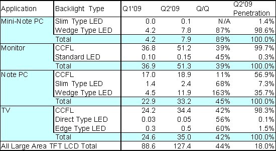 - LED背光源麵板在2009年Q2出貨量達2千300萬片,較上一季度大幅成長116%