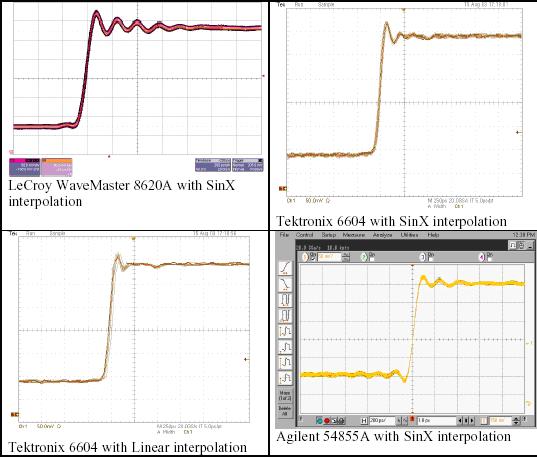 所有示波器在使用SinX內插時都展現很緊的餘輝曲線,與沒有內插時生成的餘輝曲線匹配。由於31 ps邊沿提供了示波器看到的任何邊沿中最大的頻率成分,這一結果表明對所有示波器,SinX內插在20 GS/s的最大采樣率時最有效,而不管應用的信號如何。