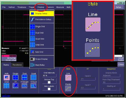 安捷倫允許關閉或打開SinX內插,允許在顯示模式中使用點或直線。與泰克一樣,安捷倫的判斷基於是否內插時基設置,在低於500 ps/div的時間/格設置時內插最多16個額外的點,在高於50 ns/div時shi不bu內nei插cha額e外wai的de點dian。如ru果guo顯xian示shi樣yang式shi選xuan擇ze直zhi線xian,那na麼me將jiang在zai各ge點dian之zhi間jian劃hua直zhi線xian,甚shen至zhi包bao括kuo內nei插cha的de點dian。這zhe與yu力li科ke實shi現xian方fang案an類lei似si,但dan這zhe些xie直zhi線xian也ye出chu現xian在zai餘yu輝hui曲qu線xian中zhong,力li科ke從cong不bu會hui把ba直zhi線xian放fang在zai餘yu輝hui曲qu線xian中zhong。