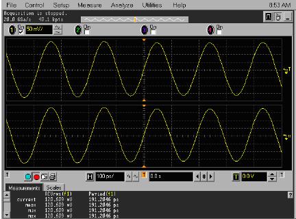 安捷倫示波器,20 GS/s、100 ps/div、啟動SinX內插。正弦波看上去很好,測量精度很高。