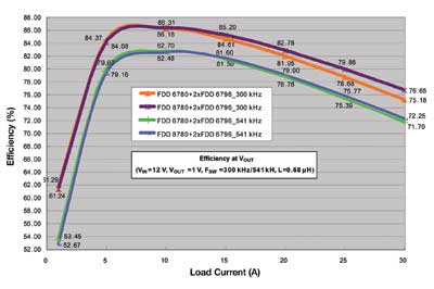 注意上麵的兩條曲線,在滿載(30A)時,可以看到最新的器件的效率有1.5%的改進。同樣還是這兩條曲線,在負荷較小(15A)時,可以實現0.69%的改善。如果對整個負荷範圍積分,那麼與今天常見的方案相比,使用最新的MOSFET器件時平均功率損耗可以降低8%~10%。即使在較高的開關頻率541kHz處,可以看到在負荷小時係統級效率仍然高於80%,而在滿載時效率大於70%。如果頻率繼續增加,那麼開關損耗將急劇增加。