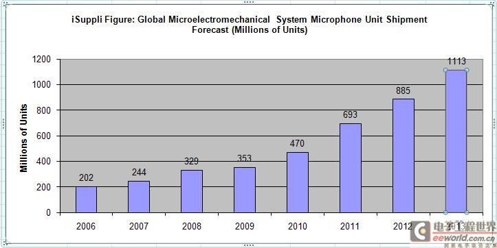 據iSuppli預估,盡管曆經2009年的衰退,但在移動手持裝置與其它類似應用的強力驅動下,2008至2013年,全球微機電係統(MEMS)麥克風仍預計將成長三倍以上。