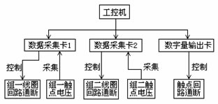 需要注意的是,當觸點電壓為交流信號時,為了保證電壓有效值的計算精度,采集卡在一個工頻周期內要完成16個采集通道至少320次的AD轉換,這就要求采集卡的采集速率非常快,本裝置采用的是研華的PCL-818HG。每塊采集卡還提供了一個20-PIN數字輸出口,yonglaikongzhishipinxianquanhuiludetongduandian。shipinchudianhuilucaiyongyikuaiduotongdaodeshuziliangshuchuka,tongguogutaijidianqishixianduiliangzushipinchudianhuiludetongduandiankongzhi。jidianqikekaoxingjiancezhuangzhidejiegoukuangturutu1所示。