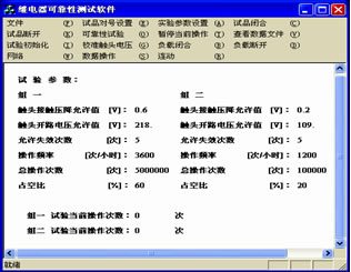 一(yi)是(shi)實(shi)時(shi)檢(jian)測(ce)與(yu)處(chu)理(li)程(cheng)序(xu),包(bao)括(kuo)了(le)試(shi)驗(yan)參(can)數(shu)的(de)設(she)置(zhi),對(dui)試(shi)驗(yan)狀(zhuang)態(tai)以(yi)及(ji)失(shi)效(xiao)數(shu)據(ju)的(de)保(bao)存(cun),對(dui)失(shi)效(xiao)數(shu)據(ju)進(jin)行(xing)數(shu)學(xue)分(fen)析(xi),打(da)印(yin)報(bao)表(biao)等(deng),檢(jian)測(ce)裝(zhuang)置(zhi)記(ji)錄(lu)的(de)失(shi)效(xiao)數(shu)據(ju)有(you)失(shi)效(xiao)時(shi)間(jian),失(shi)效(xiao)試(shi)品(pin)號(hao)、觸點號,觸點失效的類型,失效時觸點電壓以及各觸點累計失效次數等;