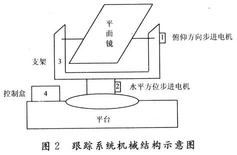 本文介紹的是一種基於單片機控製的雙軸太陽自動跟蹤係統,係統主要由平麵鏡反光裝置、調整執行機構、控製電路、方位限位電路等部分組成。跟蹤係統電路控製結構框圖如圖1所示,係統機械結構示意圖如圖2所示。