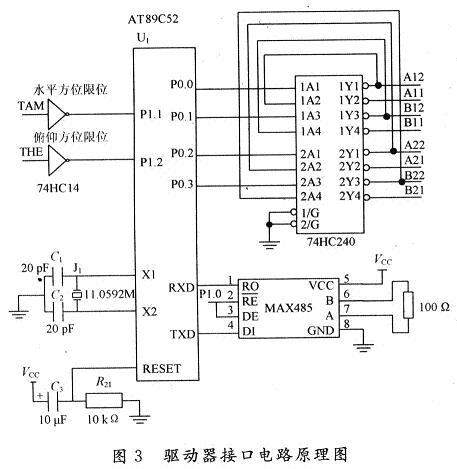 跟蹤係統中微處理器選用89係列性價比高和功耗低的89C52。74HC14芯片是6非門施密特觸發器,與P1.1和P1.2口相連,控製方位限位信號。74HC240芯片,八反相三態緩衝器/線驅動器,用於數據緩衝及總線驅動。係統使用兩片74HC240芯片,通過P0口引腳控製,兩片74HC240的16個輸出引腳作為步進電機驅動電路的輸入控製信號,分別控製步進電機俯仰方向和水平方位的正反轉。係統與上位機的通信選用MAX485接口芯片,由P1.0口控製其收發狀態。驅動器接口電路如圖3所示。