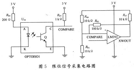 采用光電耦合器與電壓比較器電路組成的微機步進電機限位電路,其電路圖如圖5所示。