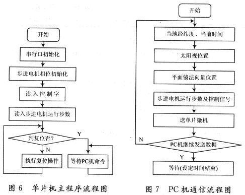 軟件的另一部分為PC機部分,PC機ji軟ruan件jian部bu分fen主zhu要yao是shi負fu責ze任ren意yi時shi刻ke太tai陽yang位wei置zhi的de計ji算suan並bing運yun用yong軟ruan件jian計ji算suan出chu當dang前qian狀zhuang況kuang下xia俯fu仰yang與yu水shui平ping方fang向xiang步bu進jin電dian機ji運yun行xing的de步bu數shu,並bing將jiang數shu據ju送song給gei跟gen蹤zong係xi統tong驅qu動dong器qi。與yu單dan片pian機ji通tong信xin的de部bu分fen使shi用yongVC++中的MSComm控件來編譯串口通訊的應用程序,采用MSComm32.OCX控件。使用控件的屬性進行串口設置,使用控件的事件驅動進行串口響應,使用控件的方法完成串行口接收和發送數據。PC機通信流程圖如圖7所示。