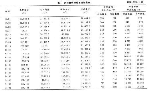 表1中列出了2009年1月12日中午至下午三時左右的理論數據,並用係統的手動校準功能,記錄下不同時刻的步進電機實際運行步數。