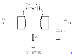 由於C2是屏蔽層的對地阻抗,在低頻範圍內,ZE《(1/jωC10),所以u2C→0。由此可見,采取屏蔽措施後,通過隔離變壓器的共模噪聲電壓被大大地削弱了。