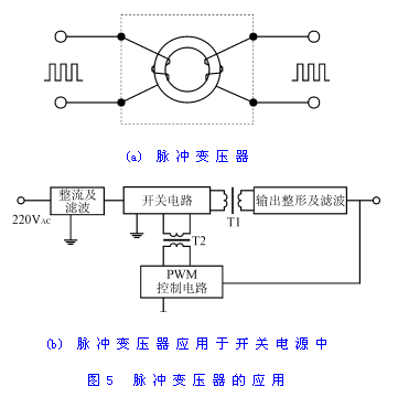 脈衝變壓器的匝數較少,而且一次繞組和二次繞組分別繞於鐵氧體磁芯的兩側,這種工藝使得它的分布電容特小,僅為幾個pF,所以可作為脈衝信號的隔離元件。脈衝變壓器傳遞輸入、輸出脈衝信號時,不傳遞直流分量,因而在微電子技術控製係統中得到了廣泛的應用。一般地說,脈衝變壓器的信號傳遞頻率在1kHz~1MHz之間,新型的高頻脈衝變壓器的傳遞頻率可達到10MHz。圖5(a)是脈衝變壓器的示意圖。脈衝變壓器主要用於晶閘管(SCR)、大功率晶體管(CTR)、IGBT等可控器件的控製隔離中。圖5(b)是脈衝變壓器的應用實例。