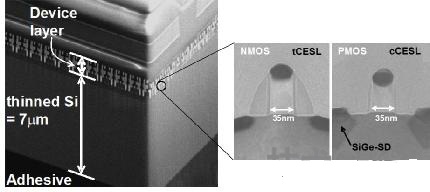 僅厚7μm的300mm晶圓的截麵照片。采用45nm的CMOS邏輯元件工藝形成了MOSFET