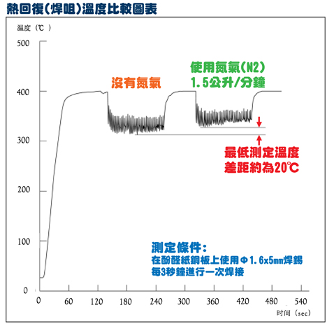 下(xia)圖(tu)表(biao)示(shi)當(dang)焊(han)咀(ju)前(qian)端(duan)吹(chui)出(chu)氮(dan)氣(qi)和(he)沒(mei)有(you)使(shi)用(yong)氮(dan)氣(qi)時(shi),焊(han)咀(ju)溫(wen)度(du)變(bian)化(hua)的(de)比(bi)較(jiao)。由(you)此(ci)可(ke)以(yi)證(zheng)明(ming)在(zai)使(shi)用(yong)熱(re)氮(dan)氣(qi)的(de)情(qing)況(kuang)下(xia),如(ru)果(guo)要(yao)把(ba)焊(han)點(dian)提(ti)升(sheng)到(dao)相(xiang)同(tong)的(de)溫(wen)度(du),焊(han)咀(ju)便(bian)能(neng)夠(gou)設(she)定(ding)較(jiao)低(di)的(de)溫(wen)度(du)進(jin)行(xing)焊(han)接(jie)。