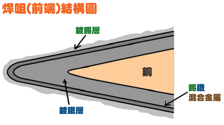 一般焊咀結構,內部主要由銅製成,外麵會鍍上鐵(鍍鐵層),而鍍鐵層前端會鍍上錫(鍍錫層),後(hou)端(duan)則(ze)會(hui)鍍(du)上(shang)抗(kang)氧(yang)化(hua)的(de)鉻(ge)。由(you)於(yu)錫(xi)和(he)鐵(tie)同(tong)樣(yang)屬(shu)於(yu)高(gao)活(huo)動(dong)性(xing)的(de)金(jin)屬(shu),所(suo)以(yi)他(ta)們(men)很(hen)容(rong)易(yi)會(hui)結(jie)合(he)成(cheng)混(hun)合(he)金(jin)屬(shu),特(te)別(bie)是(shi)在(zai)高(gao)溫(wen)的(de)狀(zhuang)態(tai)下(xia)。而(er)且(qie)在(zai)焊(han)接(jie)時(shi)所(suo)使(shi)用(yong)的(de)助(zhu)焊(han)劑(ji)(特別是高活性的)亦是加速他們產生混合金屬反應的催化劑。