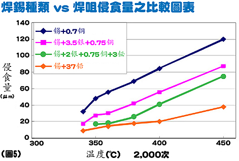 不同成份的焊錫會對焊咀有不一樣的侵蝕速度。圖5表示 錫+0.7銅 對焊咀的侵蝕速度最快,然後是 錫+3.5銀+0.75銅,錫+2銀+0.75銅+3鉍,而最後是 錫+37鉛。