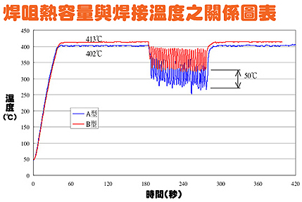 答案是B型。由於B型焊咀比A型咀焊粗(銅的部份),所以B型比A型的熱容量也較大和導熱性較快。雖然兩支焊咀形狀一樣(尖端部份),但B型咀身比較粗,焊咀越粗,銅的部份越大,保持溫度穩定的能力也越大。(請參考以下圖表)