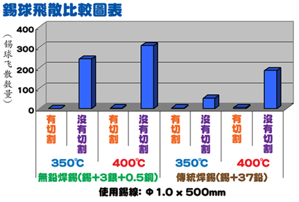 白光375 V-Cut 自動出錫機能夠把含助焊劑的錫線切割V形溝,防止錫線裏的助焊劑因膨脹而造成飛散。這個創新的方法明顯能夠減少焊錫及助焊劑飛散,並同時改善焊錫的擴散性。 (請參考以下圖表)