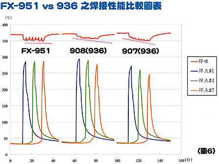 圖6顯示FX-951的焊點溫度最高,在連續焊接過程中,溫度仍然保持穩定。而907的溫度跌幅比較908的大,因為907的熱容量比較908的小。焊接溫度會根據焊點的大小而有所不同,如果焊點麵積較小,使用907焊接也可以達到滿意的焊接效果。但根據圖6所示,FX-951的回熱速度明顯是最快的,能夠把電路板上每個焊點都提升到合適的焊接溫度。