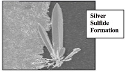 硫liu化hua銀yin是shi不bu導dao電dian的de,而er持chi續xu暴bao露lu在zai硫liu環huan境jing中zhong將jiang意yi味wei著zhe更geng多duo硫liu化hua銀yin的de形xing成cheng,直zhi到dao所suo有you的de銀yin都dou完wan全quan轉zhuan化hua成cheng硫liu化hua銀yin。導dao電dian層ceng將jiang因yin此ci被bei中zhong斷duan,而er該gai元yuan件jian將jiang變bian成cheng開kai路lu。對dui任ren何he汽qi車che或huo工gong業ye設she備bei製zhi造zao商shang而er言yan,這zhe是shi一yi種zhong特te別bie令ling人ren沮ju喪sang的de現xian象xiang,因yin為wei它ta是shi一yi種zhong在zai製zhi造zao時shi完wan全quan無wu法fa檢jian測ce的de潛qian在zai故gu障zhang。有you些xie汽qi車che和he工gong業ye設she備bei製zhi造zao商shang已yi經jing通tong過guo密mi封feng電dian子zi設she備bei,成cheng功gong地di阻zu止zhi了le硫liu化hua銀yin的de形xing成cheng,但dan要yao將jiang該gai方fang法fa應ying用yong於yu所suo有you情qing況kuang並bing不bu可ke行xing,而er且qie這zhe並bing不bu是shi一yi種zhong能neng確que保bao防fang止zhi硫liu汙wu染ran的de可ke靠kao方fang法fa。