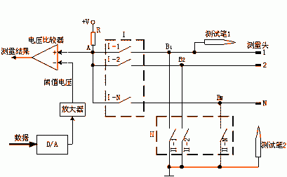 shixianzidongceliangdeqiantishijiangbeiceyuanjianyinjiaolianrutancedianluzhong,weicitanceshebeishezhiruogangeceliangtou,tongguodianlanyinchu,celiangtoukeguajiegezhongceshijiajuyuyuanjianyinjiaojianlilianjie,celiangtoudeshuliangjuedingletongyipilianrutancedianludeyinjiaoshu。ranhouzaichengxukongzhixiatanceyianzuheyuanzeyicijiangbeice"引腳對"一一納入測量通路。在測量通路中將"引腳對"之間的通/斷路狀況呈現為引腳間有無電阻,測量通路將其轉換為一個電壓量,由此判斷它們之間的通/斷路關係並加以記錄。