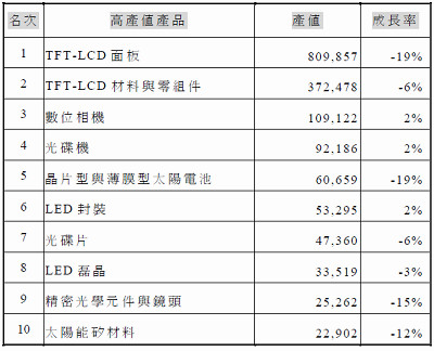 台灣地區光電十大產品 (單位:百萬台幣/%)