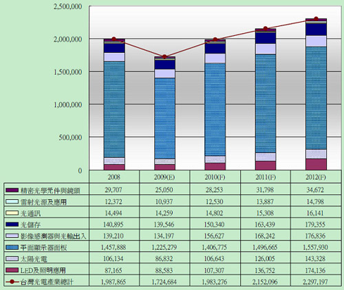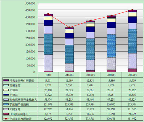 根據光電科技工業協進會(PIDA)的分析,2009年全球光電市場持續受到全球金融風暴的影響,又從2008年的4,220億美元,大幅衰退了23%,跌到3,235億美元,可謂創下有史以來最大的跌幅;更甚於1997年的亞洲金融風暴和2000年的通訊市場泡沫化。預期全球光電市場將會於2010年反彈,成長16%;亦高於以往的成長率,然後再以10%左右逐年回升。