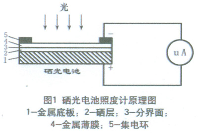 測量照度的儀器是照度計,或稱勒克斯計。照度計通常是由硒光電池或矽光電池和微安表組成,見圖1。硒光電池是把光能直接轉換成電能的光電元件。當光線射到硒光電池表麵時,入射光透過金屬薄膜4到達半導體硒層2和金屬薄膜4的分界麵上,在界麵上產生光電效應。產生電位差的大小與光電池受光表麵上的照度有一定的比例關係。這時如果接上外電路,就會有電流通過,電流值從以勒克斯(Lx)為刻度的微安表上指示出來。光電流的大小取決於入射光的強弱和回路中的電阻。照度計有變檔裝置,因此可以測高照度,也可以測低照度。