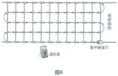 本方案是將具有記憶和存貯功能的TES—1333型照度記安置在高檔電動遙控的履帶式玩具裝甲車(以下簡稱為測試小車)上,該測試小車的驅動係統受站在路邊的測量者手中的遙控器和測試小車內安置的可編程控製器為主體的自動控製係統控製,當車內的自動控製係統啟動時,裝甲車將按照事先設定的動作程序沿如圖8所示的箭頭方向完成行走程序,並采用四點法在每個矩形網格的四角處自動完成照度測量和記錄,存貯任務,待全部程序結束後,測試小車在遙控器的操縱下自動返回測量者所在位置。遙控器的另一作用是在車內控製係統失靈的情況下,由測量者手動遙控完成全部的測量過程,並在道路出現行駛車輛時緊急召回測試小車。